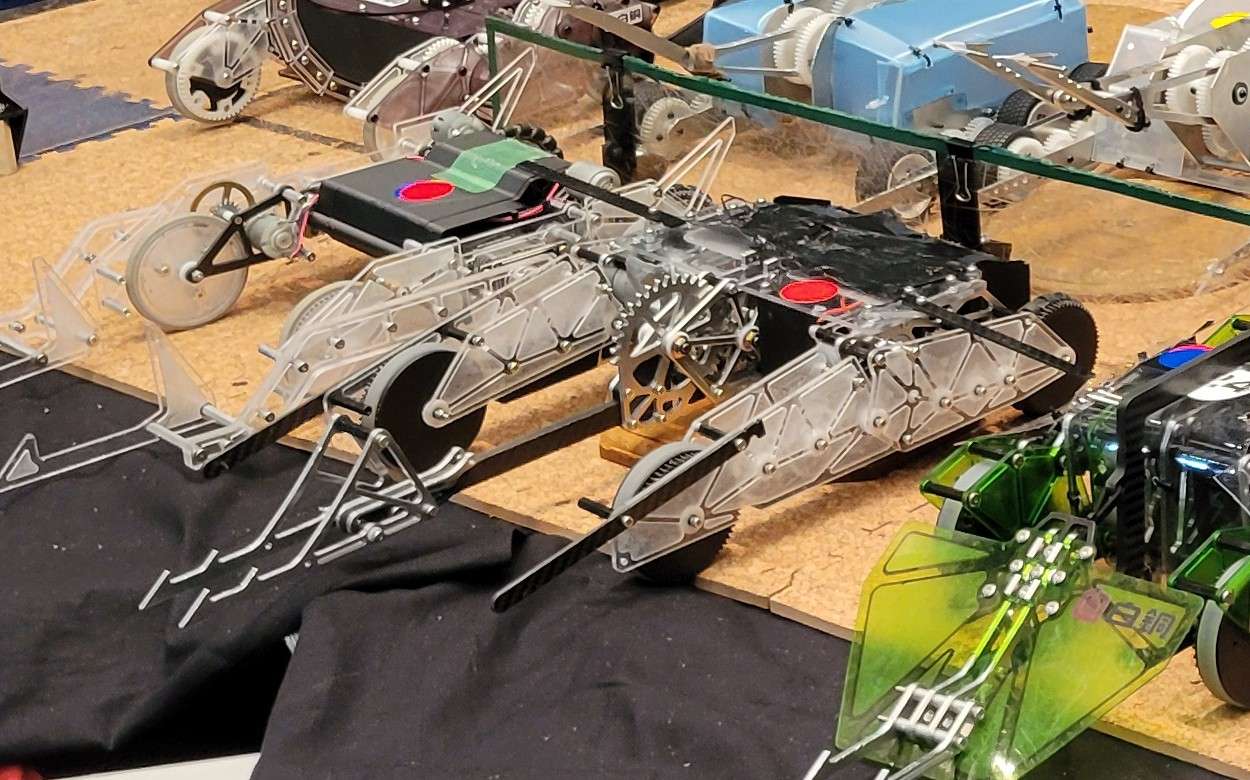 今大会では大柄な機体に必要十分な速度まで減速したアーム、脚周りやオムニホイールを実装することにより、